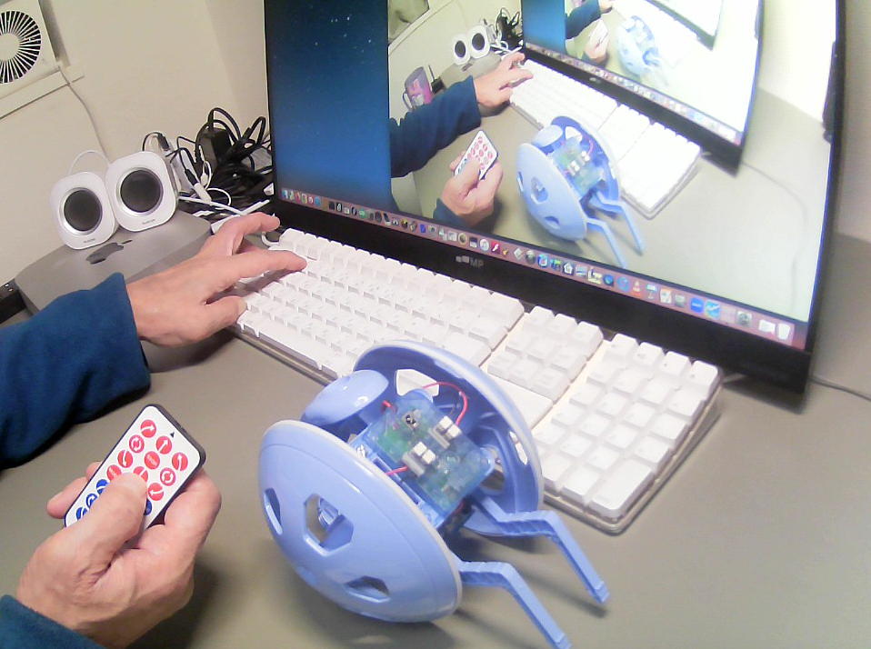 そしてロボット教室に行って、無事に生徒のロボット制作が進むように支援した。 自分のサンプル教材のプログラミングは教室の合間に行ったが、今回のものは「リモコンで操縦するだけ」ということで、一発で動いた。 YouTube動画 のように、なかなか可愛い動きなのだった。