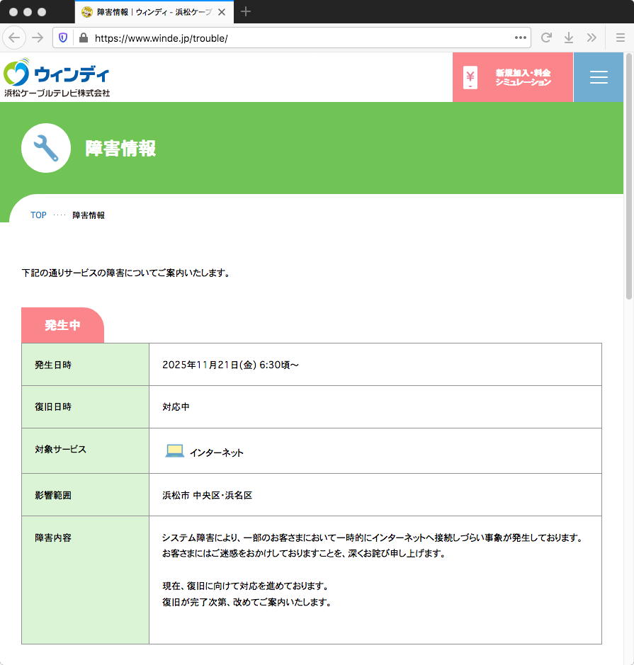 今日は晩にロボット教室の日なのだが、なんと朝から「インターネットが繋がらない」という状態がずっと続いた。 僕は自宅に「浜松ケーブルテレビ ウィンディ 光回線」を契約しているのだが、これがトラブルで途絶するのは2度目である。 電話しても「障害の復旧に努めています」との自動音声だけで、結局、数時間も途絶していて、午後13時過ぎになってようやく復旧した。