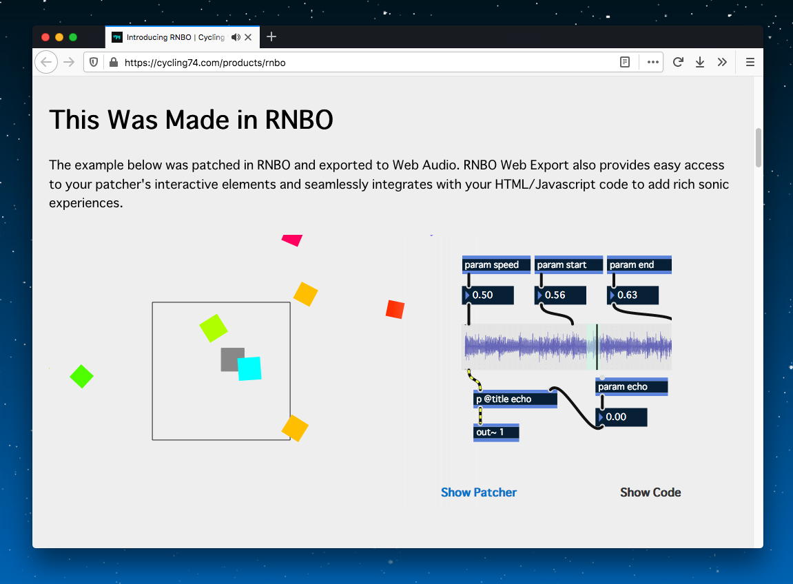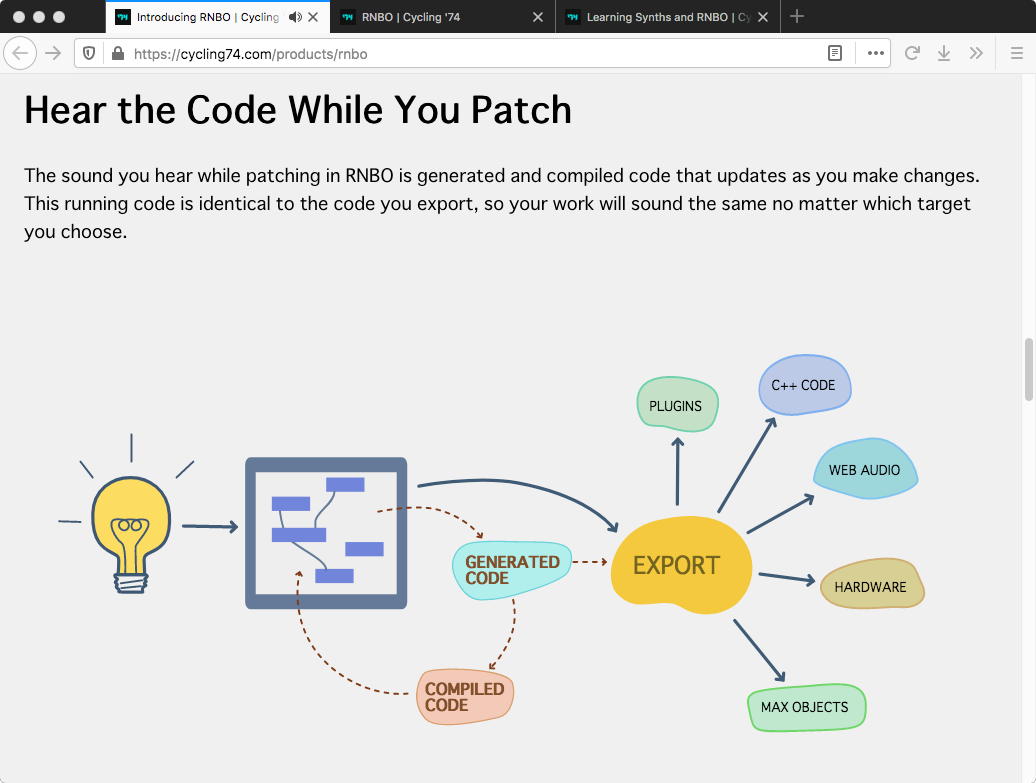 - Jitter - RNBOテクノロジーは現在、DSPおよびMIDIコード生成に限定されている。GLSLシェーダーコードのエクスポートについては、jit.gl.pixおよびgenコードのエクスポートを参照のこと