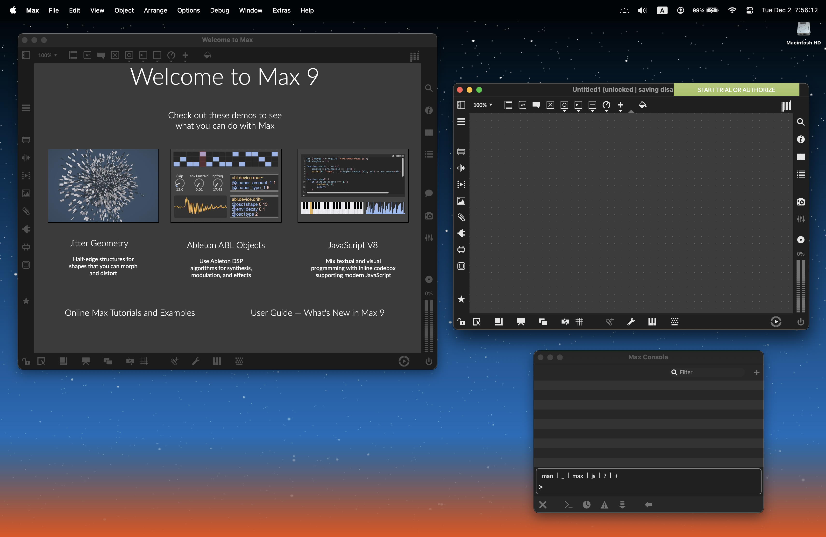 今日は晩に久しぶりのロボット教室に出掛ける予定があるだけという日なので、さっそく朝から昨日の続きに取り掛かった。 机の上はちょっと混雑するが、お仕事Mac miniの前に新MacBookAirを置いて、 Quickstart から開始して、そのscreenshotは自分から自分宛にGmailで送ってここに置く、という段取りである。 Maxサンプルを即座にMaxで起動する、というメカニズムがあるので、正にQuickstart、簡単に開始できた。