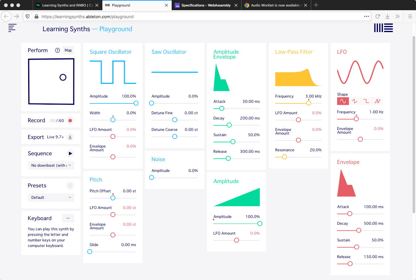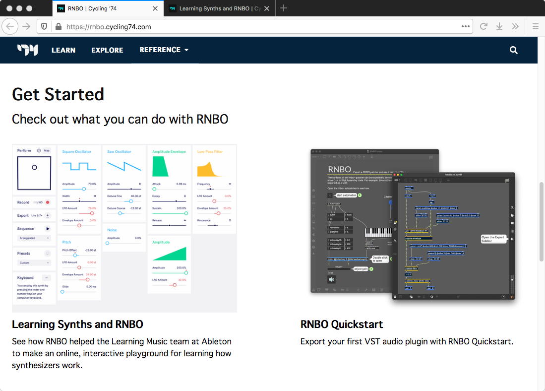 「Getting Started」という大きな括りでは、あと2件、 Why We Made RNBO と Coding Resources というアーティクルだけとなった。 前者はなかなか「熱い」文章だが、要するにMaxのデザイン思想をより広い世界に拡張していきたい、ということだった。 後者はいよいよこれから僕も勉強すべき情報源がずらりと並んでいた。 RNBOからexportするターゲットのうち(Max externalは今日、ものにした)、後半にあった「Plugin/Standalone Development」はとりあえずは不要なのだが、前半の「Web Export」こそ、まさにここから学ぶべき世界である。 「Tasks」として8項目(これは項目のみ)、「Tutorials」として6項目★、「Tools」として8項目★、そして★は全て厖大な世界へのリンクなのだった。Tasks