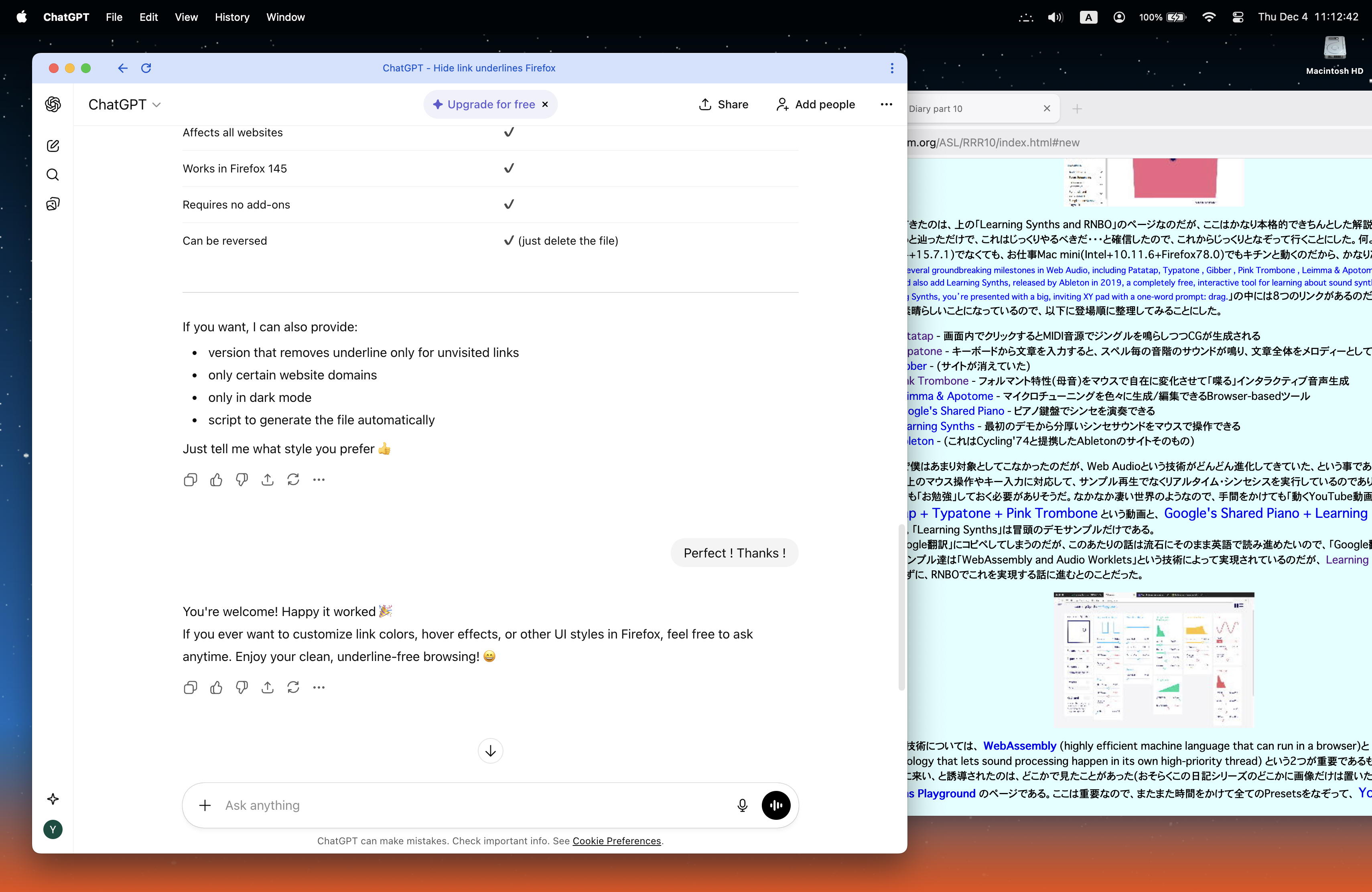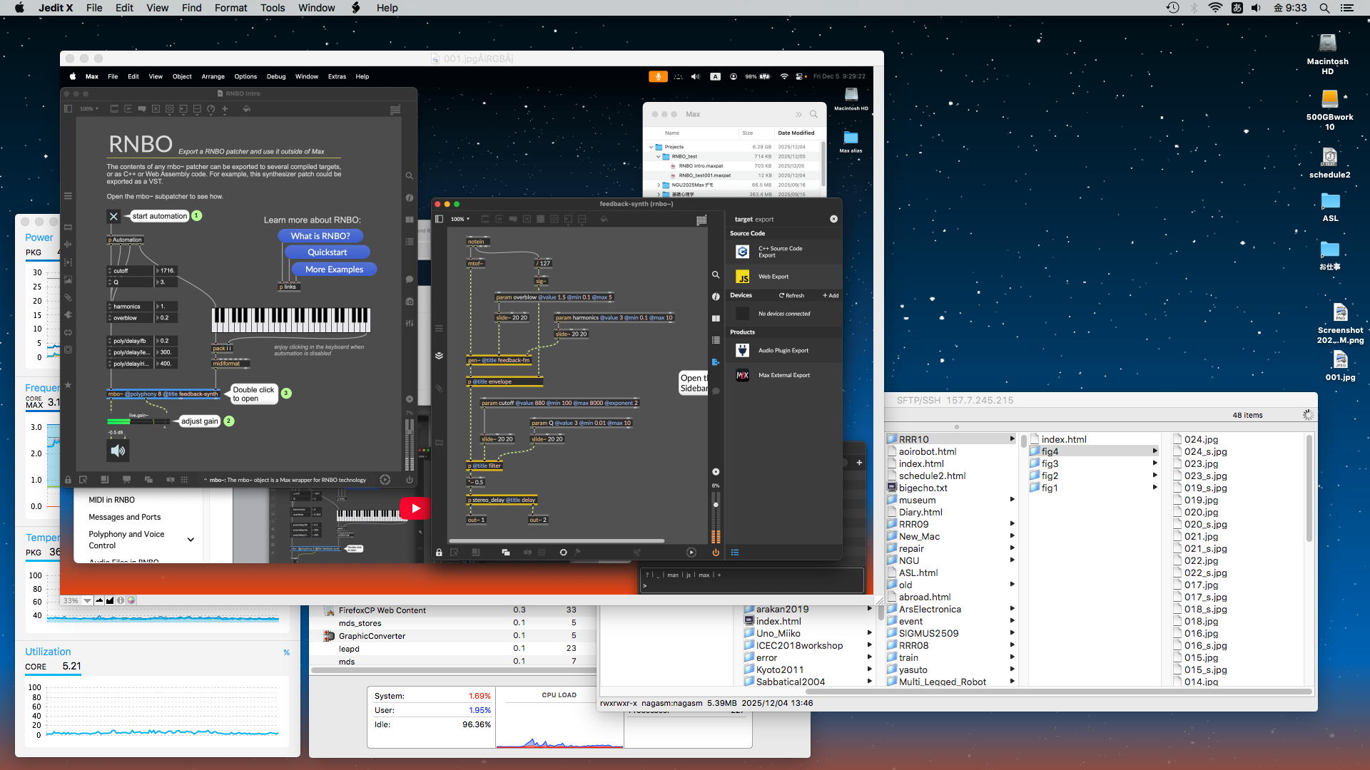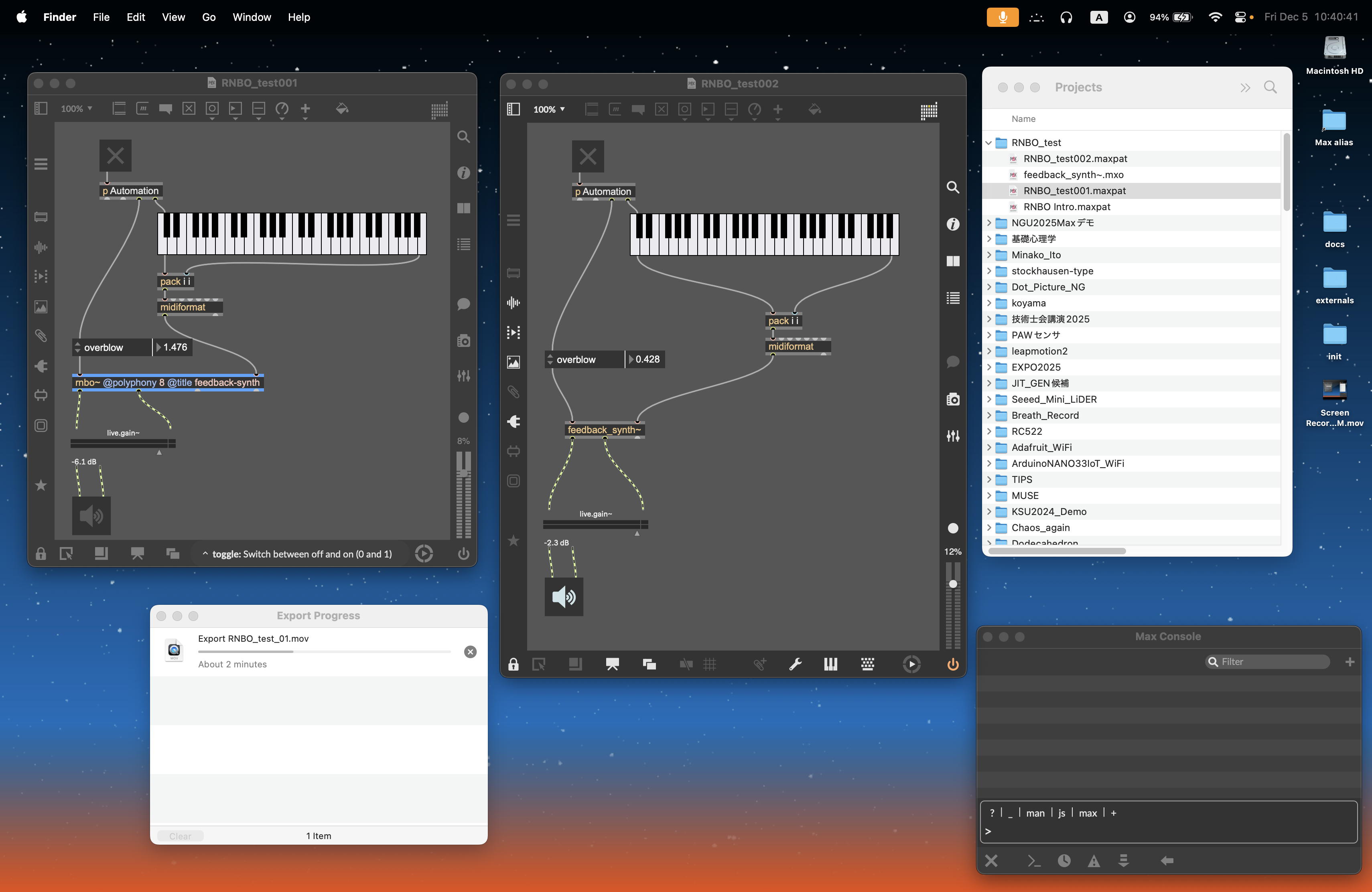 そして約1時間ほどかけて、「RNBOからExportする」という部分が出来てしまった。 上のscreenshotを見ると、左側のパッチは「rnbo~」を使ったサンプル(簡略版)なのだが、それを右側のように「feedback_synth~」という名前のMax ExternalにExportしたものになっているのだ。