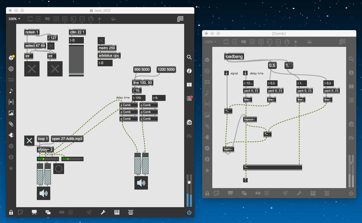 1998年「SFC録音[笙]音響素材」"IBUKI"を活用した、欧州ツアー[20]で公演した筆者の作品"Visional Legend ver.2001"[76]★のMaxパッチ[77]を開いてみたが、あまりに複雑で自分でも読み解けないと判明した。そこで320本の東野さん笙サウンドのうちアドリブで約3分間ほど演奏した"27-Adlib.aiff"をmp3化して[78]、これをループ再生した音響を「本番での東野さん演奏」に見立てた音源として、まず図1のようなMaxパッチで櫛形フィルタによるエフェクトを実験し、次に図2のようにステレオのマルチチャンネル・コーラスが良好に実装できると確認して、ここから6月6日のレクチャー"IBUKI demonstration"用に増設して仕上げていく方針とした。その翌日の試作状況[79]★では2画面にまで拡張されて、オリジナルで内部的にGENまで活用したモジュールとして「マルチchorus」・「ピッチshift」・「フランジャー」・「スムースmulti delay」などが実現できた。ライヴの現場では、東野さんの笙サウンドをサンプリングしてこれらのエフェクトをかけて、それぞれのパラメータを筆者が舞台袖で即興的に操作するというシナリオのために、サウンド関係のMaxプログラミングはとりあえずここまでで「完了」とした。
