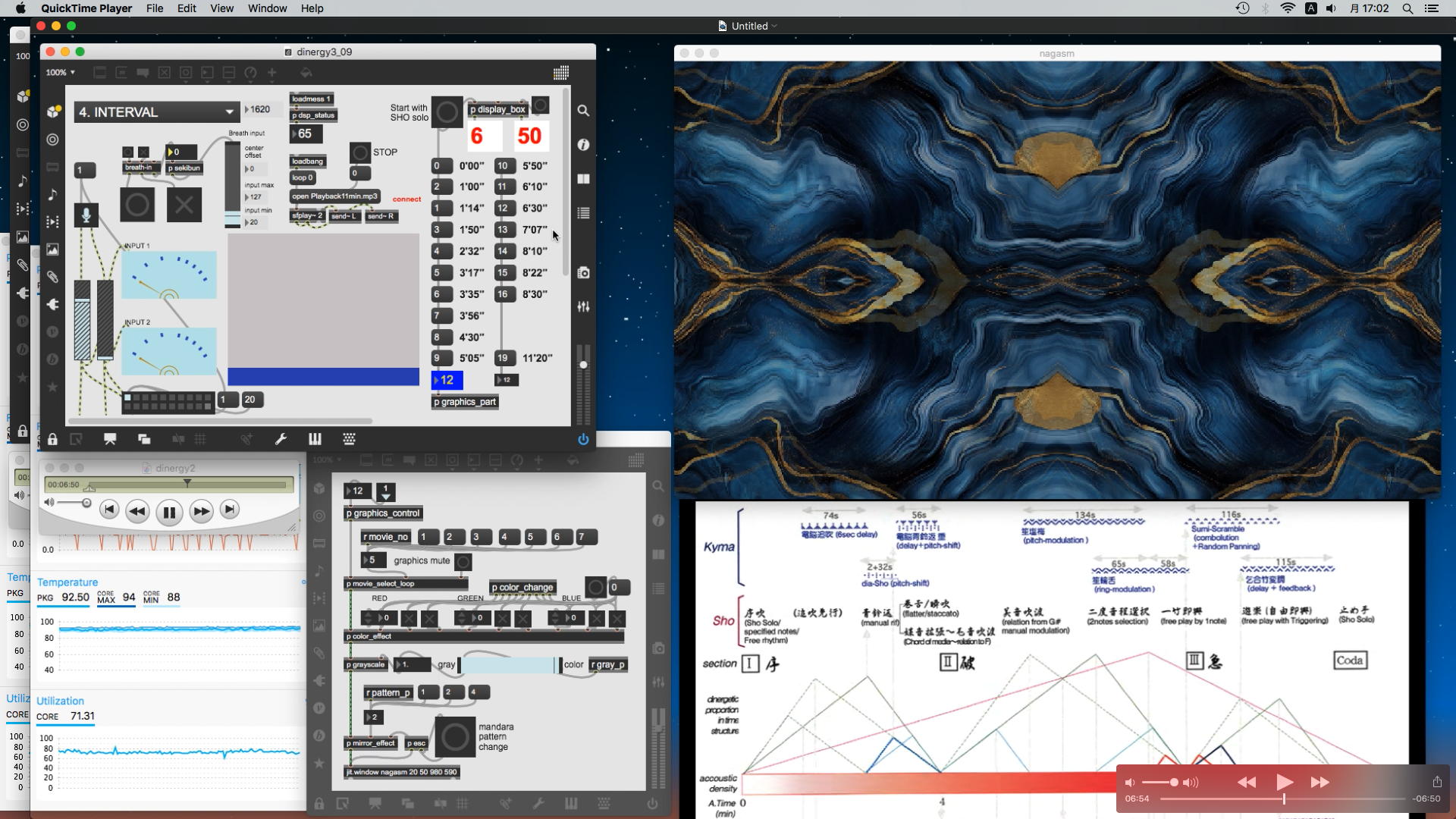 図6 "dinergy2"の再現実験そして4月下旬、"IBUKI demonstration"のための道具立てとも重複するのだが、楽譜に従って演奏していくサウンドパートに合わせて変容していくグラフィックパートの実験/試作が図7のように始まった。ここで問題となったのは、筆者のIntelCPUのMacではAppleSiliconに比べて処理能力が低いためか、GPUを活用したGENであっても図8のように「CPU温度」が軽く90℃を超えて、Activity MonitorのCPU稼働率も250%ぐらいまで跳ね上がった[84]。このMacはIntel i5(4コア)で、全て最大にスケジューリングした場合に「400%」というのが理論的最大値なので、Max/jitter/GENのパッチ1つで「250%でCPU温度が90℃超え」というのは、ほぼ限界に近いというか、ライヴで走らせるのはかなりリスキーである。その後も何度か実験試作を作っては東野さんに連絡して相談するプロセスを重ねた[85]★[86]★。