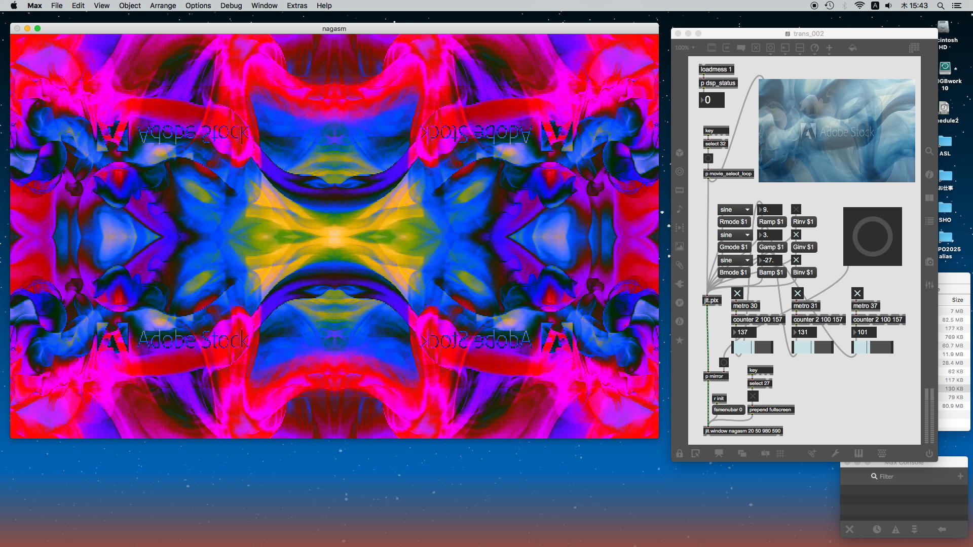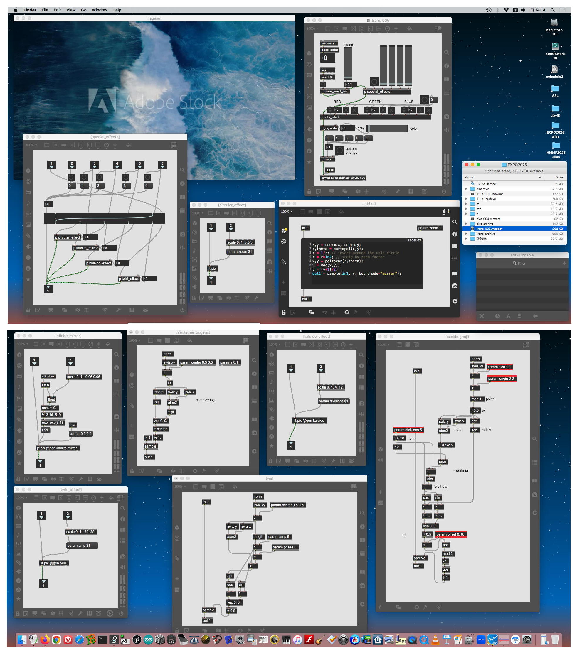 本項で紹介するのは、「多数の素材ソースから選択して」・「シームレスのループ動画として表示する」というMaxプログラミングに関する、ややテクニカルな情報(3件)である。素材(動画・静止画)が数本程度であれば、Maxパッチの置かれたディレクトリに横並びに置いて、ファイル名を明示的に指定してopen/readすればいいのだが、数百本からリアルタイムに(randomを含む)指定するとなると作戦は異なってくる。さらに今回発見したのは、数多く出回る「フリー素材」だけでなく、名門「アドビ」商品の有料素材集であっても、考慮すべき大きな課題を孕んでいたという事だった。なお、ここで報告する情報はOSX El CapitanのMac版Max(8.5.7)における状況であり、Windows版その他の異なる環境については不明である。図13は、今回のMaxプログラミングに関する"EXPO2025"ディレクトリの中身と、その中の「visual_test」ディレクトリの中にある「pict_004.maxpat」という実験中のパッチの様子である。ここではランダムに選ばれる素材静止画としてサブディレクトリ「p」内に「101.jpg」〜「490.jpg」の連番とした390本を用意していて、それを上の階層にあるMaxパッチから呼び出す手法のサンプルとなっている。Maxでは横並びでない別階層のファイル指定には「相対パス」でなく「絶対パス」が必要なので、「thispathcr」オブジェクトでパッチ自身が置かれたルートからの絶対パスを文字列として取得して、そこに下の階層のパスを付加してファイル指定する。この例ではそこに同じ桁数として101から999までの連番ファイルを指定すれば簡単になるという、ちょっとしたテクニックである。