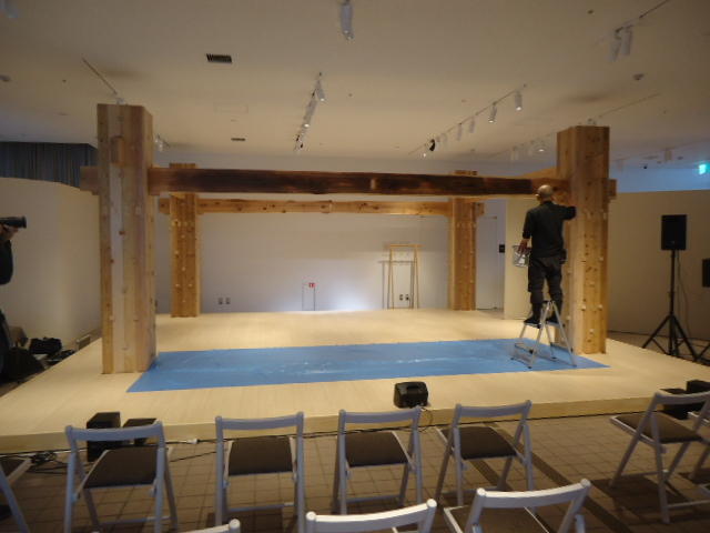 公演当日の朝に柱を塗装中の舞台普通のComputer Musicライブコンサートであれば、ステージの奥にスクリーンがあってグラフィクスが投射され、さらにステージの左右にはPAスピーカが並んで、ミキサー卓は客席中央の一部に配置されるが、このような一般的な環境とは程遠いものだ、と当日朝に現地集合して覚悟した。まだ柱を塗装中だったステージ袖[59]にテーブルを並べて機材を準備したが(その隣にミキサー卓)、サウンドチェックどころかまだプロジェクタも到着しておらず、スクリーン代わりの壁面(ポップアップステージ南の出演者控室スペースとの仕切り)の場所も未確定だった。