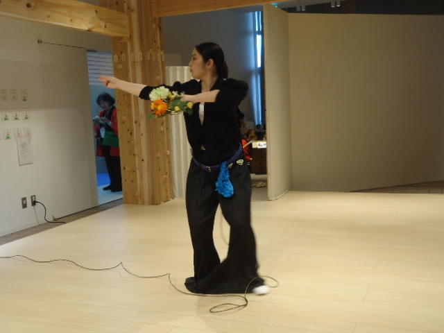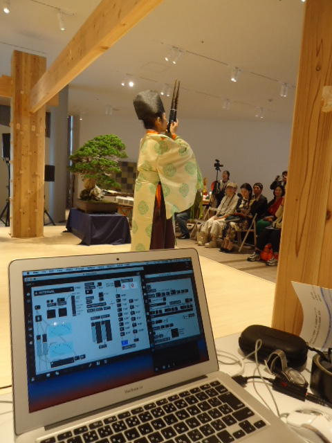 伊藤光波子氏の舞楽ただしこの6月3日の「コンサート」全般としては、冒頭に思い付いて笙の即興演奏を披露して客席を温めた東野さん[60]、小笠原清基氏の弓の実演[61]、[まり+東野+Gerard]のセッション[62]、さらに加わった伊藤光波子さんの舞楽[63]、などが次々に進んで、それほど音楽的に専門家というわけでもない満席の来場者(万博観光客)は珍しいパフォーマンスの連続に十分に満足してくれた。ステージ中央の光波子さんの舞楽の身体動作情報を「MUGIC」(←伏線[F])で取得して、まりさんのMaxパッチで生成グラフィクスをインタラクティブに変化させたのだが、ステージから横方向にかなり離れた壁面に投射したので、聴衆は舞楽とスクリーンのどちらかを見る感じになったのが残念だったものの、結果として、プロジェクトの「パート1」全体としては成功したと言える。