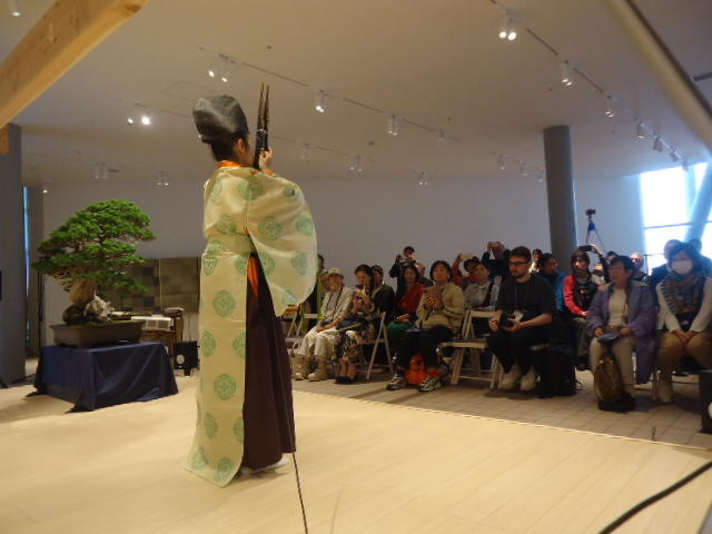 実際の会場「伝統文化未来共創Project」企画の会場は、EXPOホール"シャインハット"、ギャラリーEAST、ポップアップステージ南、という互いに隣接する3つの建物であり、「シャインハット」は巨大なホールでメイン企画「令和今昔四季物語絵巻」のステージ、また「ポップアップステージ南」は屋外の吹き抜け舞台であり、雨天の場合には東野さん企画を行う「ギャラリーEAST」に演目が割り込んでくる・・・と知って驚いた。この「ギャラリーEAST」は正方形の一つの隅が楽屋に削られた五角形のような建物で、後方には国内各地の名産品の物販コーナーがあり、ステージは「47都道府県大黒柱プロジェクト」[50]★★によって全国から集められた「束ね柱」で作られており(当日朝に会場入りしてみるとまだ柱の汚しステイン塗装中)、そのステージ最前部には万博1970で展示された樹齢1000年の盆栽(55年前に1億円)[51]が鎮座する、というものだった。