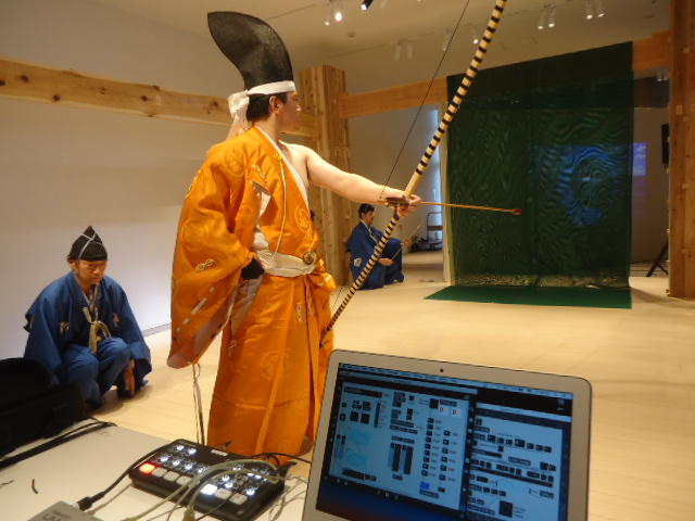 世界唯一の「象牙製の笙」いざ前日にリーフレット[56]を受け取ってみると、メンバーに弓馬術礼法小笠原源流31世守家の小笠原清基氏が載っているのが不明だったが、6月3日のステージの冒頭に登場して、その場でステージ上で弓を放つ腕に「MUGIC」(←伏線[F])が装着されていて、そのデータで木村まりさんがサウンド生成とスクリーンCGを変化させる「デモ」となっていたのは、当日その現場(ステージ袖)で初めて理解した。