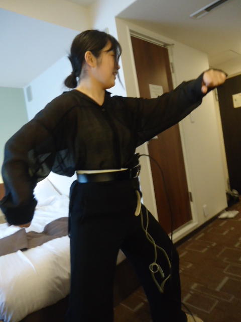 海外組が早々にボストンICMCへと旅立ってしまった6月5日は、翌日の「パート2」の準備のため午後に東野さんホテルに集合しての打合せから始まった。複数のソース(長嶋+まり+Gerardの3台のPC)なのに一度もサウンドチェックできなかった「パート1」の音響/映像系のトラブルは、翌日の「パート2」では音源が筆者だけになったので現場で対応できるだろうとの判断で、東野さんの笙即興演奏に長嶋エフェクトが加わるデモンストレーションは、「笙演奏のブレスで画像が回転する」という動作を確認して終わった。そして筆者の持参した「呼吸センサ」[45]を装着して伊藤光波子さんが試みにホテルの部屋で舞ってみて、センサ情報をそのまま単純にグラフ化しても十分である、と確認でき[64]、このBGMには筆者が光波子さんから受け取った雅楽のサウンドを使用することにした。