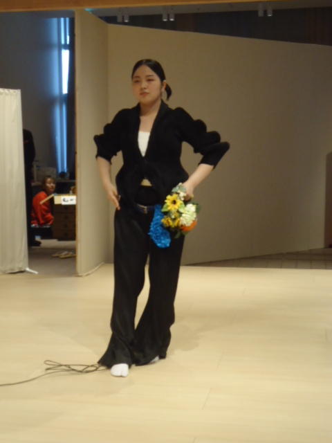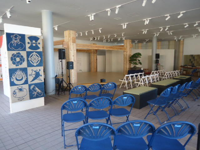 延長ケーブルでのテストそして6月6日に会場「ギャラリーEAST」に着いてみると、PAの機材やプロジェクタなどが何故か大幅に変更されていて、さらにスタンド式スクリーンがステージ横に立つ(盆栽の反対側)ような配置になっていた。スタッフが奔走して、なるべく良好な環境のために努力してくれていたことに感謝しつつ、しかしこの日も簡単なサウンドチェックだけで、とりあえずスクリーン(またまた演者からは全く見えない)にグラフィックが出るところまでを確認して「休憩」(他の企画のステージ本番)をまたぐことになった。我々の出番の前には、同じステージ上を刻々と模様替えしては「落語」・「義太夫」・「きものコンテスト」などの企画が行われていた。